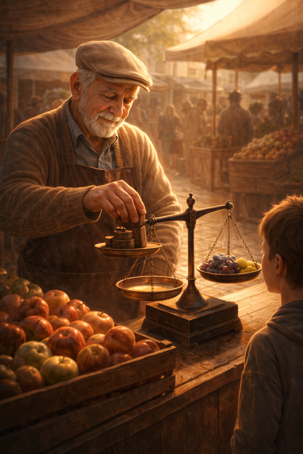 Egy kisváros piacán volt egy öreg árus, aki gyümölcsöt mért.